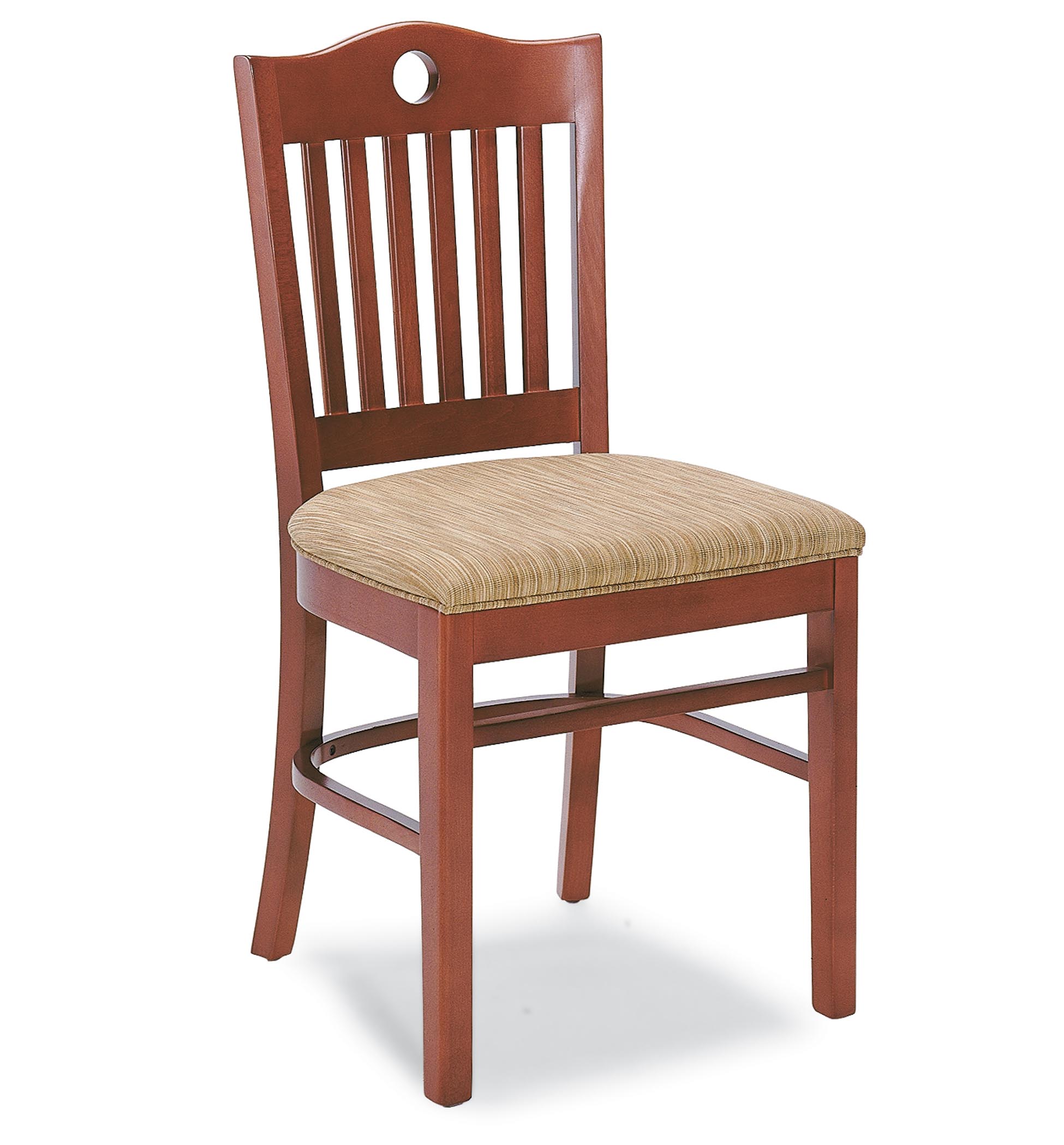 Wood school house side chair with upholstered seat and wood vertical slat back. Minimum order of 25 chairs.